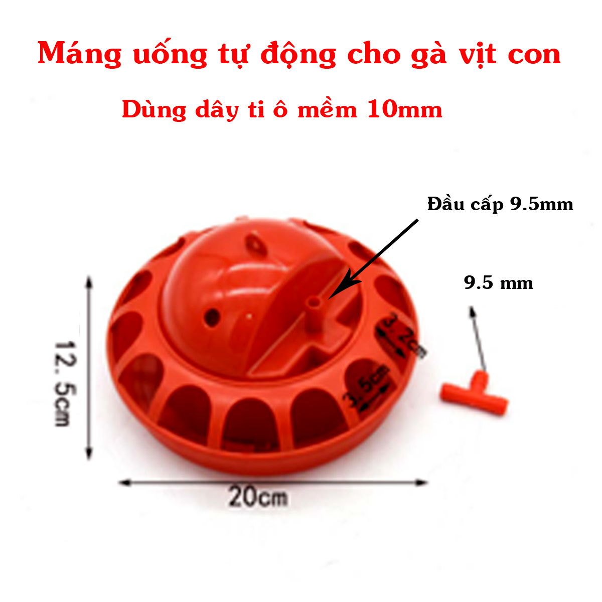 - Đường kính đế 20 cm, cao 13 cm, rãnh uống 2.8 cm, đường kính bầu máng trên 13cm. Phù hợp gà ngan vịt úm.