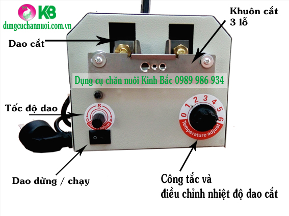 Máy cắt mỏ gà 9QD-4 sử dụng động cơ tốc độ chậm thông qua các bánh răng giúp lưỡi dao nhiệt chuyển động dập lên dập xuống. Bà con điều chỉnh tốc độ dập nhanh hoặc chậm của lưỡi dao bằng núm vặn ở bên trái và điều chỉnh được nhiệt độ của lưỡi dao cắt bằng núm vặn bên phải.